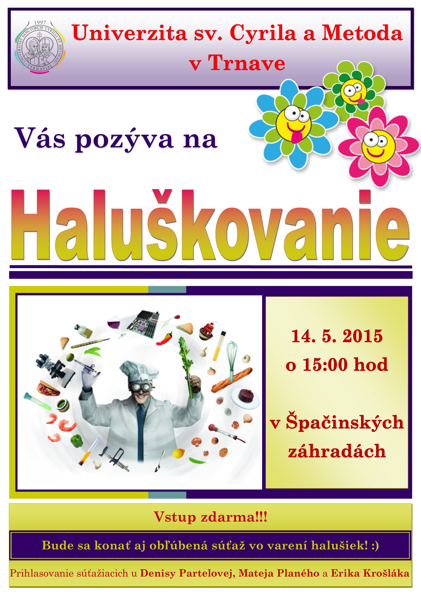 Dear students, employees and friends of the UCM, we would like to invite you to the traditional competition in cooking sheep cheese dumplings ‘Haluškovanie’, which will take place on Thursday, 9 May 2019 at 15:00 p.m. in the gardens of Špačince (behind the building of the Faculty of Natural Sciences in Špačince).