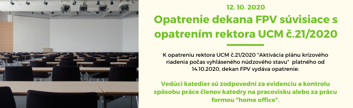 Vzhľadom na meniacu sa situáciu s opatreniami súvisiacimi so šírením vírusu COVID 19, dekan FPV UCM v Trnave doc. Ing. Jozef Sokol, CSc. oznamuje študentom, že v prípade priaznivej situácie a ďalšieho uvoľňovania bezpečnostných opatrení sa štátne skúšky budú konať na všetkých študijných programoch na FPV prezenčnou formou.