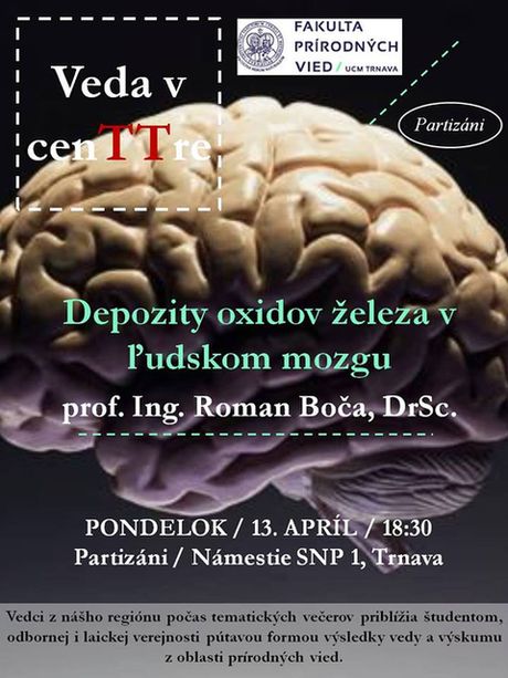 13. apríla 2015 o 18:30, bar Partizáni. Pokračovanie úspešných tematických prednášok Veda v cenTTre. Prednášku „DEPOZITY OXIDOV ŽELEZA V ĽUDSKOM MOZGU“ predniesol držiteľ ocenenia "Vedec roka 2011" prof. Ing. Roman Boča, DrSc. - odborník v oblasti experimentálnej a teoretickej magnetochémie. Po jej skončení nasledovala voľná diskusia. Doplňujúce informácie