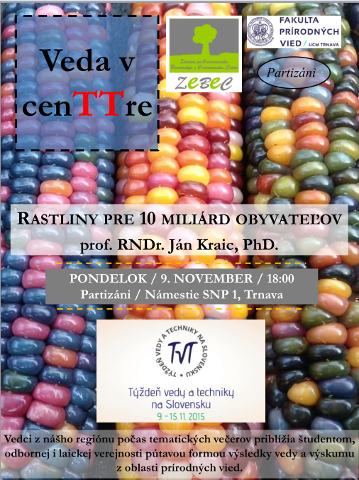 09. novembra 2015 o 18:00, bar Partizáni. Pokračovanie úspešných tematických prednášok Veda v cenTTre. Prednášku „Rastliny pre 10 miliárd obyvateľov“ predniesol prof. RNDr. Ján Kraic, PhD. v rámci Týždňa vedy a techniky na Slovensku. Po jej skončení nasledovala voľná diskusia. Doplňujúce informácie